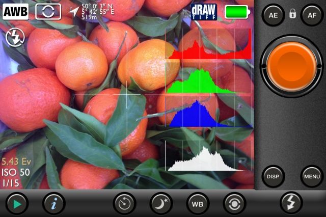 Features include a choice of HI_Quality JPEG, MAX-Quality JPEG, or dRAW TIFF output; tap-to-focus and set-and-and lock; 4:3 and 1:1 image ratios; real-time ISO, shutter-speed, and GPS readouts; night mode; 6X digital zoom; and lots, lots more.