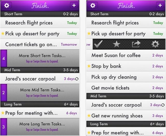 Entering a task is a simple as giving it a name and a date, and Finish’s unique “timeframes-based” interface automatically displays your most important tasks at the top. Finish also offers push notifications, so you can’t forget what needs to be done if you don’t open the app one day.